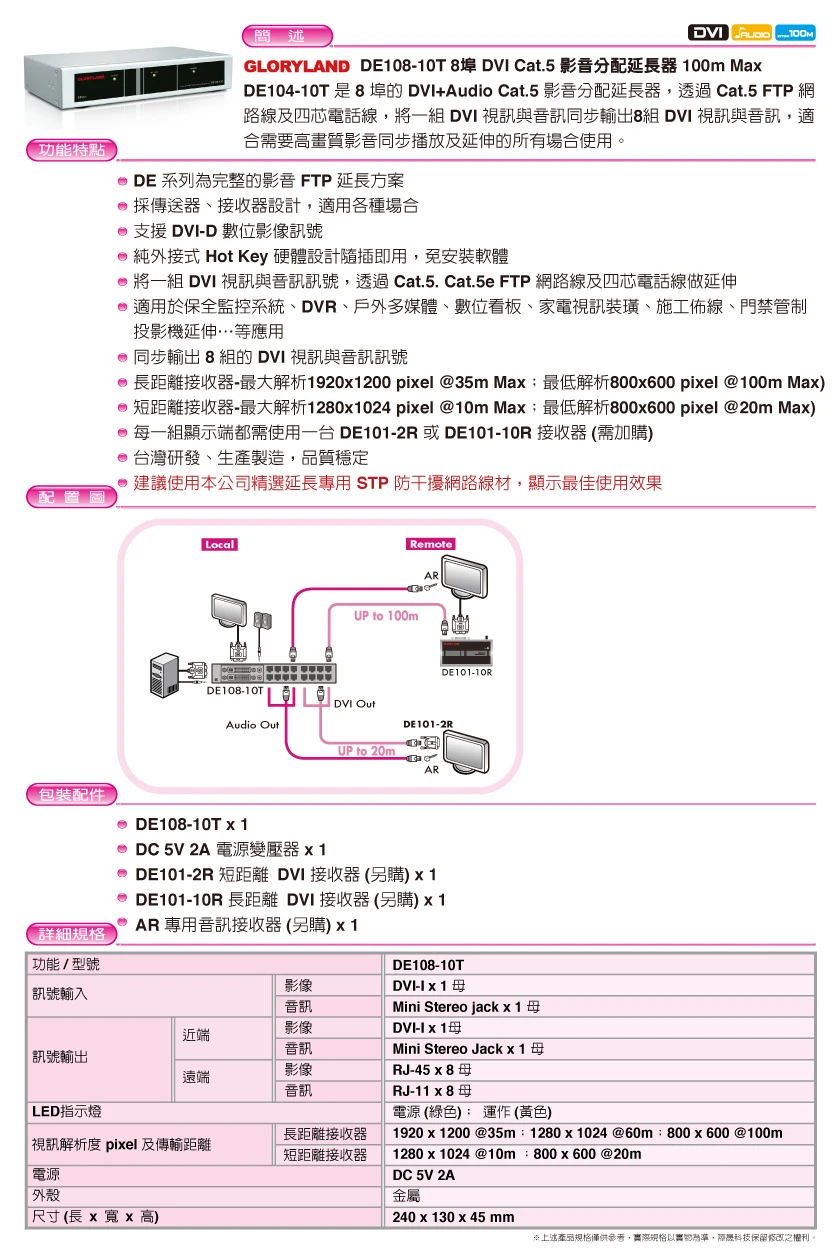 GLORYLAND DE108-10T 8埠 DVI Cat.5 影音分配延長器 100m Max DE108-10T 是 8 埠的 DVI+Audio Cat.5 影音分配延長器,透過 Cat